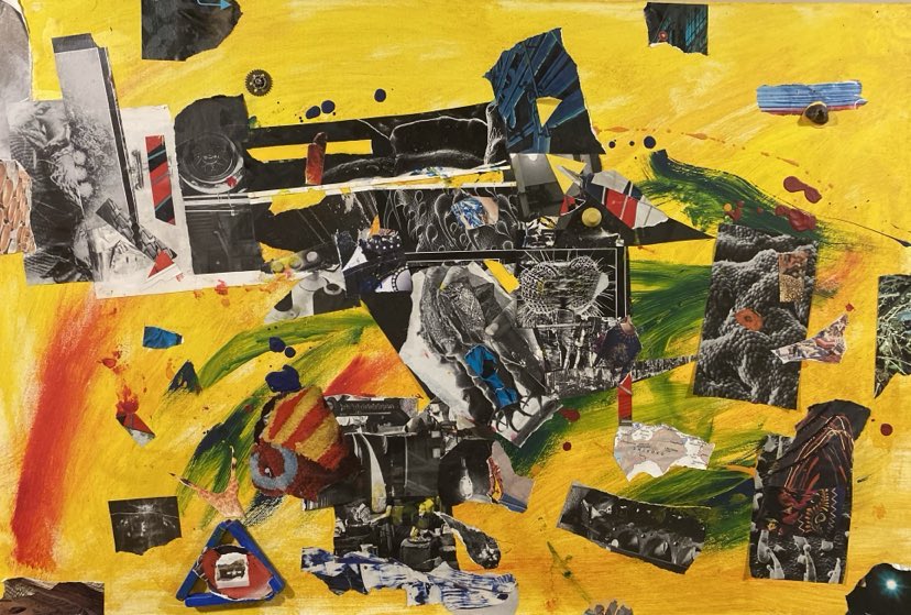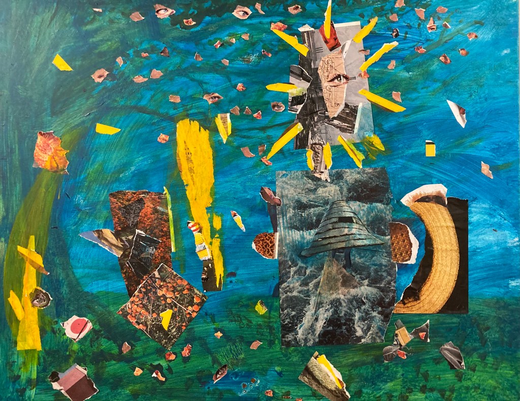 “Sticky Yggdrasil” is a mixed media piece that delves into the mythological depth of Yggdrasil, the Norse World Tree. Created quickly and instinctively, the piece captures a raw, subconscious energy. Eyes scattered across the top lend a watchful quality, implying that Yggdrasil itself is observing the world. Among fragmented layers of yellow, brown, and torn textures, the Striga character—a figure with a waterspout body—emerges subtly, blending into the tree’s natural landscape.