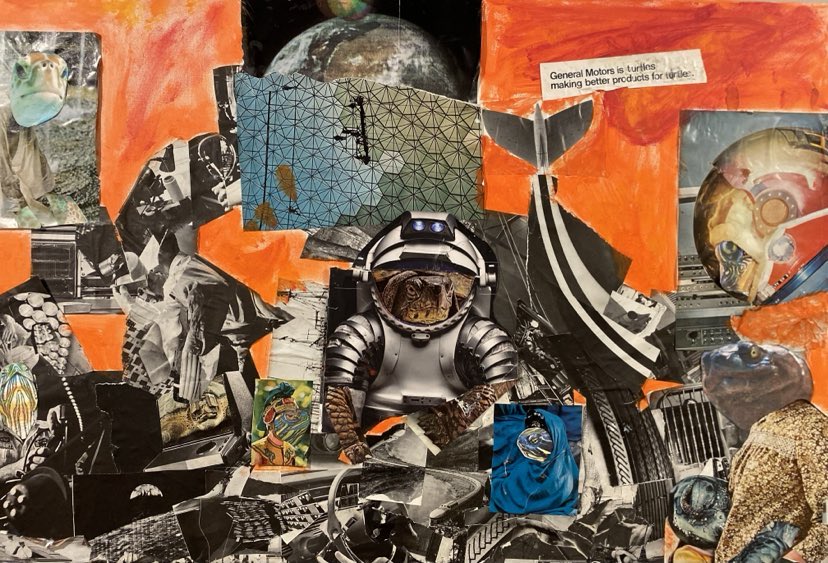Adding the slogan “General Motors is turtles making better products for turtles” underscores the piece’s playful yet critical stance. It pokes fun at corporate influence, turning a mundane slogan into a surreal commentary on industry’s absurd claims. Altogether, this piece captures a collision of nature and technology, hinting at the endurance of the natural world amidst humanity’s relentless, often reckless, progress.