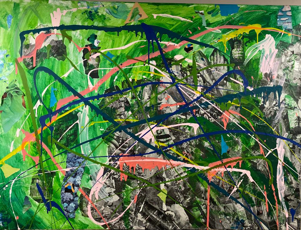 The painting’s chaotic energy, from the unruly splatters to the controlled placement of collage, reflects a world where humanity and nature stand in tension. Andromeda Triumphant is a vision of a victory that isn’t just personal but symbolic—a reminder that nature, like Andromeda, can endure and even thrive despite what’s inflicted upon it. The work captures a complex triumph, one marked by scars from the battle between technology and the organic world, and it challenges us to look closer, to consider our role in this ongoing struggle and the cost of attempting to conquer what is beyond us.